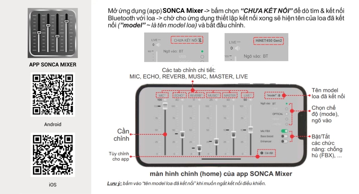 Sử dụng ứng dụng (app) ACNOS Mixer kết nối Bluetooth với loa HiNet 450 Gen2 để điều khiển, tinh chỉnh chi tiết thêm cho bộ xử lý tín hiệu nhạc, micro, vang,... của loa, cho phù hợp với không gian và sở thích nghe nhạc, hát karaoke của bạn. Quét mã QR ở trên hoặc vào CH Play hoặc App Store để cài đặt và sử dụng ứng dụng.